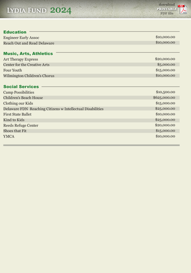 The Lydia Fund, formed on the death of Lydia C. duPont in 1958, was created for the benefit of The Children’s Beach House, Lewes, Delaware and focuses on the needs, medical care, treatment and education of underprivileged children throughout the State of Delaware.