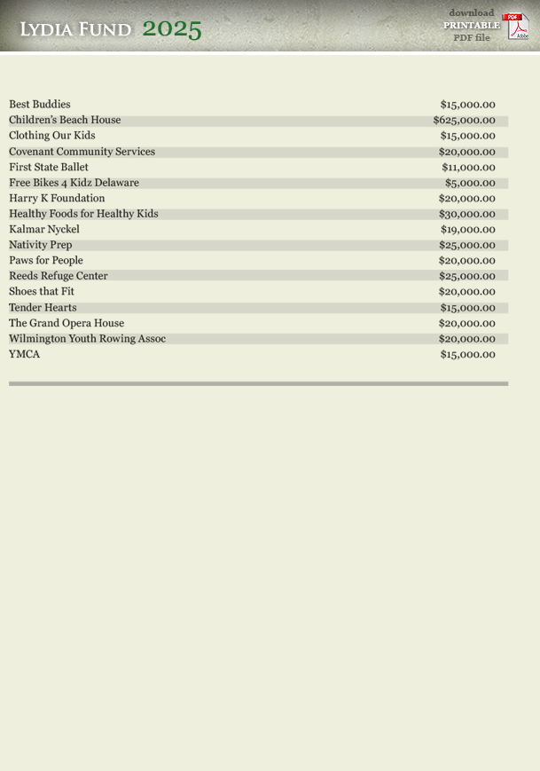 The Lydia Fund, formed on the death of Lydia C. duPont in 1958, was created for the benefit of The Children’s Beach House, Lewes, Delaware and focuses on the needs, medical care, treatment and education of underprivileged children throughout the State of Delaware.